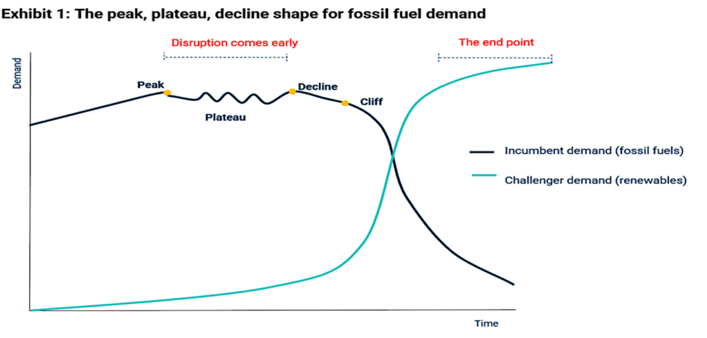 Change starts slow then speeds way up. The bumpy roads to disaster recovery and social change in Solnit’s article remind me of the mix of advancement and setback we now experience during the energy transition from fossil fuels to renewables. We’ve passed peak coal and are now in a bumpy plateau around peak oil and gas, as shown in the figure below from the Rocky Mountain Institute (RMI). During the next few years, reductions in the demand for oil and gas sparked by last summer’s Inflation Reduction Act will be punctuated by setbacks as the incumbent fossil-fuel interests fight to retain control. Living through this plateau period is bound to be stressful because every setback seeds new doubt that the successful transition to clean renewable power will actually occur.